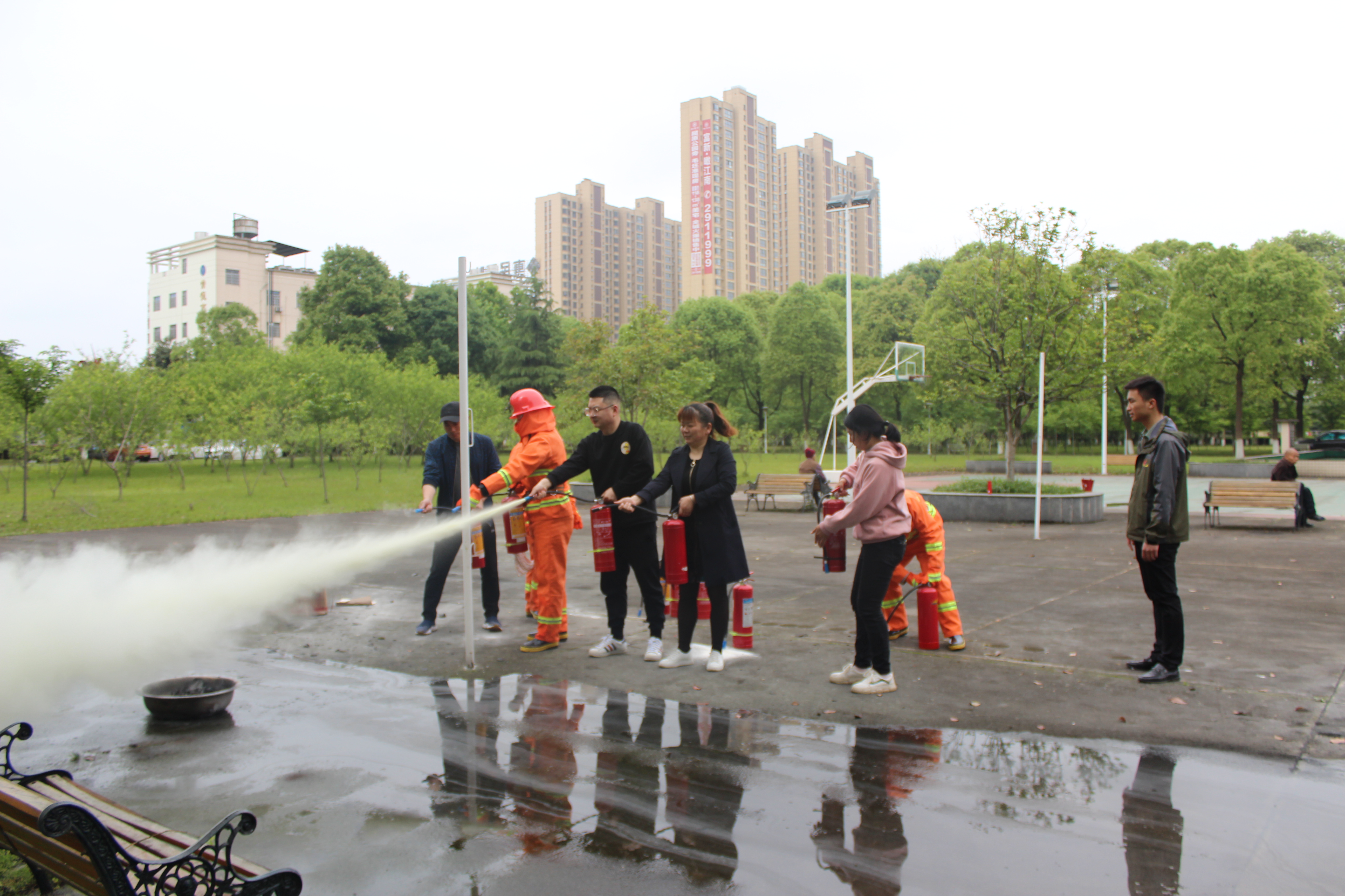讲座结束后,全体干部职工和临聘人员在院内操场集合,在黄教官和院志愿消防服务队的指导下以两人一组的形式进行了干粉灭火器和消防水带的现场实操。接着,组织干部职工和临聘人员在收养楼开展逃生疏散演练。随着疏散演练消防警报铃拉响,收养楼各层工作人员迅速做出反应,立即带领老人们,一组一组按指定路线有序疏散到院内安全区,与此同时,院志愿消防服务队迅速安装好消防水带,组织进行初期火灾的扑灭。整个逃生疏散过程各组快速反应,行动迅速,基本达到了预期的演练目的。
